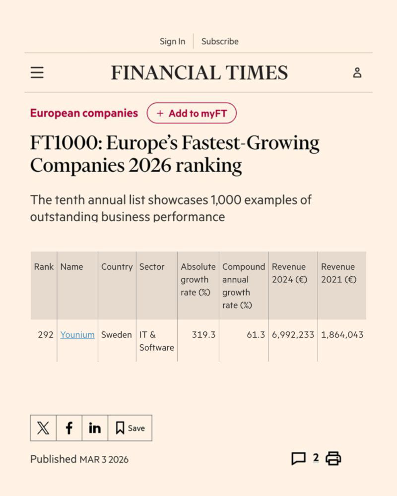 Mar 9, 2026 − Younium has been ranked #292 on the 2026 FT1000 list. Compiled annually by the Financial Times in collaboration with Statista, the ranking recognizes the 1,000 fastest-growing companies …